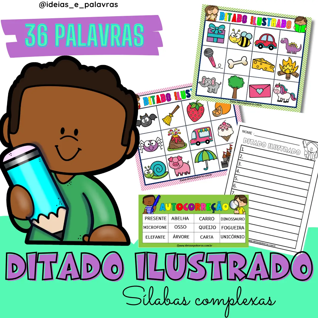 Comece a trabalhar a leitura e escrita das sílabas complexas de forma lúdica com este material em PDF. O Ditado Ilustrado Sílabas Complexas traz imagens coloridas e cartelas de apoio que ajudam crianças a desenvolver vocabulário, concentração e fluência leitora, tornando a alfabetização divertida e prática.